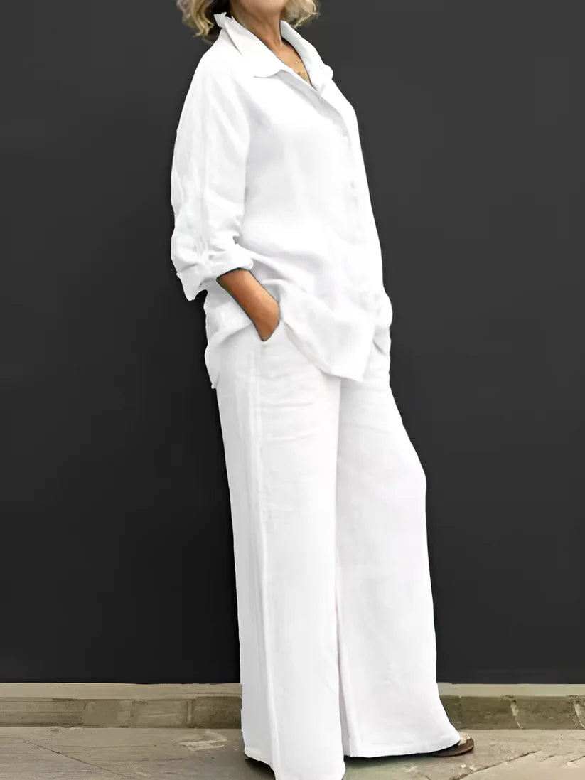 The Sienne Linen Shirt Suit was created for women who want polished style with breathable comfort. With its airy fabric blend and relaxed yet refined silhouette, this two-piece set transitions seamlessly from city strolls to resort evenings. Wear the blouse and trousers together for a timeless look, or style them separately for endless versatility.
